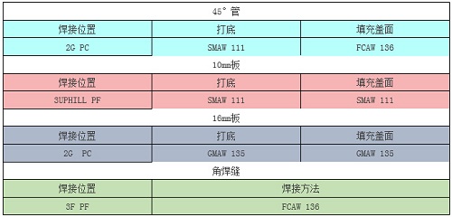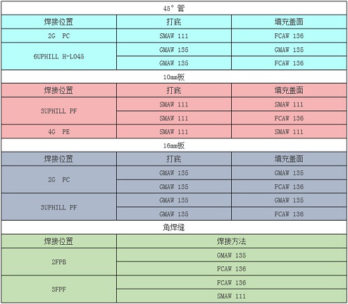 組合件包含管、10mm板、16mm板和角焊縫四個試件。焊接完成后進(jìn)行外觀檢查、折斷檢驗(yàn)、射線探傷。四個試件的焊接方法和焊接位置在賽前從下表中抽取確定。
