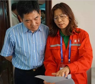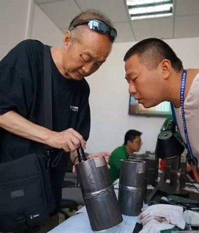 仲裁組成員張友權(quán)(左)檢查試件