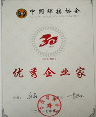 翟總獲得“中國焊接行業(yè)優(yōu)秀企業(yè)家”榮譽(yù)