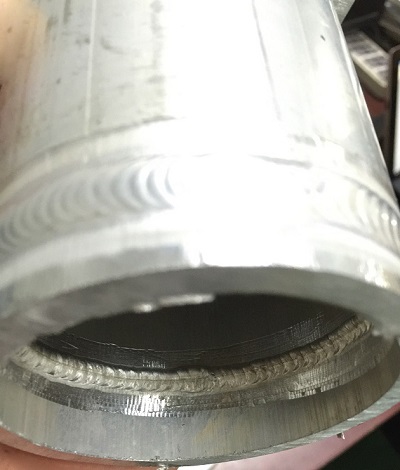 第二模塊鋁合金構(gòu)建中鋁管的焊接難點(diǎn)主要在于背部融透(如圖6)和內(nèi)在質(zhì)量的保證。背部融透主要是考驗(yàn)選手對熔池的理解,在組對焊縫0間隙的情況下,如何能夠識(shí)別熔池溫度是否達(dá)到,送遞焊絲時(shí)間的選擇,這些都至關(guān)重要,而且在焊接過程中,由于鋁合金的導(dǎo)熱系數(shù)大,焊接過程中隨著溫度的上升,焊接速度也會(huì)越來越快,如果手法跟不上,只是依靠小電流慢速焊,這樣就會(huì)在某一點(diǎn)(比如引弧處)不停的加熱,局部時(shí)間加熱久了焊縫內(nèi)部會(huì)很容易出現(xiàn)過熱裂紋,焊縫表面發(fā)白無光澤,所以鋁合金焊接一般要求大電流快速焊接,也是為了在引弧初期就能夠快速打開鋁合金表面的Al2O3薄膜。該薄膜熔點(diǎn)高達(dá)2050℃,極大地超出了鋁的熔點(diǎn)(660℃),由于這層薄膜的保護(hù),所以鋁不易產(chǎn)生腐蝕,但在焊接時(shí),Al2O3會(huì)阻礙熔池金屬良好結(jié)合,容易形成夾渣氣孔等缺陷,可以說是焊接的障礙,所以在鋁合金焊接中要想達(dá)到探傷一級確實(shí)很難。一般要先進(jìn)行酸堿水清洗或機(jī)械清理等前期處理。還要保證干燥不潮濕的情況下焊接才能夠保證質(zhì)量,當(dāng)然對于選手的焊接操作技能也是首選。這次參賽的65名選手中,該項(xiàng)射線探傷滿分40分的情況下只有一人滿分,30分以上的有7人,內(nèi)在質(zhì)量不得分的占多數(shù)。這與鋁合金焊接普及面較窄也有關(guān)系。隨著這項(xiàng)賽事的不斷進(jìn)展。我想在不久將來大家一定會(huì)攻克難關(guān),充分掌握好這門技術(shù)。
