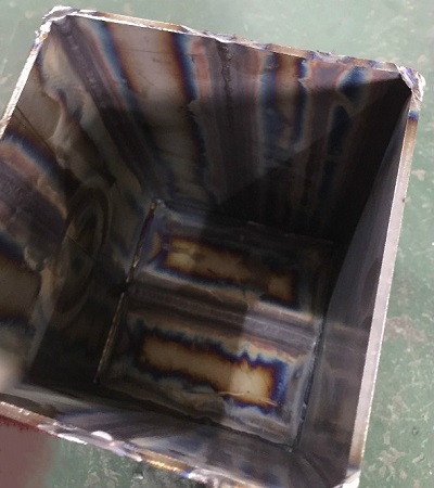 對于第三模塊中不銹鋼結(jié)構(gòu)件的焊接,個(gè)人觀點(diǎn)是其焊接難點(diǎn)要更甚于鋁合金的焊接。眾所周知不銹鋼在高溫狀態(tài)下非常容易氧化,而且變形量也較大。這次的不銹鋼結(jié)構(gòu)件組對完畢后,所有焊縫根據(jù)要求都不允許留間隙、開坡口焊接,并在背部充氣的情況下實(shí)現(xiàn)單面焊雙面成型(如圖7),它的焊接難點(diǎn)之一首先是為防止變形,如何選擇好組對之后的焊接順序,其次是焊接過程中如何能夠保證一次焊接背部成型和表面焊縫成型不氧化,乍聽起來好像這兩點(diǎn)有些矛盾,首先要想保證在不留間隙的情況向背面焊透,就要使熔池的溫度充分達(dá)到,而熔池溫度一旦過高焊縫表面就很容易氧化發(fā)黑,本屆比賽各路選手也是各顯其能,對于氬弧焊噴嘴的使用從6號(hào)嘴到10號(hào)甚至更大都有使用。其實(shí)從理論上來講,要想使氬弧焊接不銹鋼表面成型好,顏色好,主要就是氣體的保護(hù)效果,如果比賽允許使用氬氣保護(hù)拖罩進(jìn)行三重保護(hù),即熱影響區(qū)也保護(hù)起來,那么焊縫達(dá)到銀白色的金屬光澤也是有可能的,但這次只允許兩重保護(hù)(即內(nèi)充氣和氬弧槍本身氣體),那么對于焊縫的正表面只能采取大口徑噴嘴進(jìn)行,才能擴(kuò)大保護(hù)范圍,如果條件允許,也可以采用噴嘴內(nèi)裝有濾網(wǎng)的大口徑噴嘴進(jìn)行焊接,這樣的氣體保護(hù)會(huì)更均勻。但前提是采用大噴嘴口徑的焊槍對焊接過程中選手對熔池觀察的視線會(huì)有所影響,也要逐漸適應(yīng)。這次大賽對于大噴嘴的使用只有少數(shù)單位想到了這一點(diǎn)。隨著本次大賽的結(jié)束,我想以后對于不銹鋼焊接的氧化問題,會(huì)有更多的單位熟悉、掌握,甚至想出更好的辦法來解決不銹鋼焊接氧化的問題。