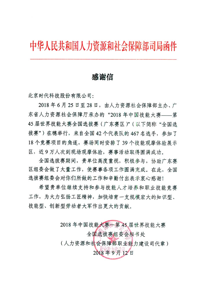 2018-09 第45屆世界技能大會全國選拔賽 組委會感謝信 中國人力資源和社會保障部職業(yè)能力建設司