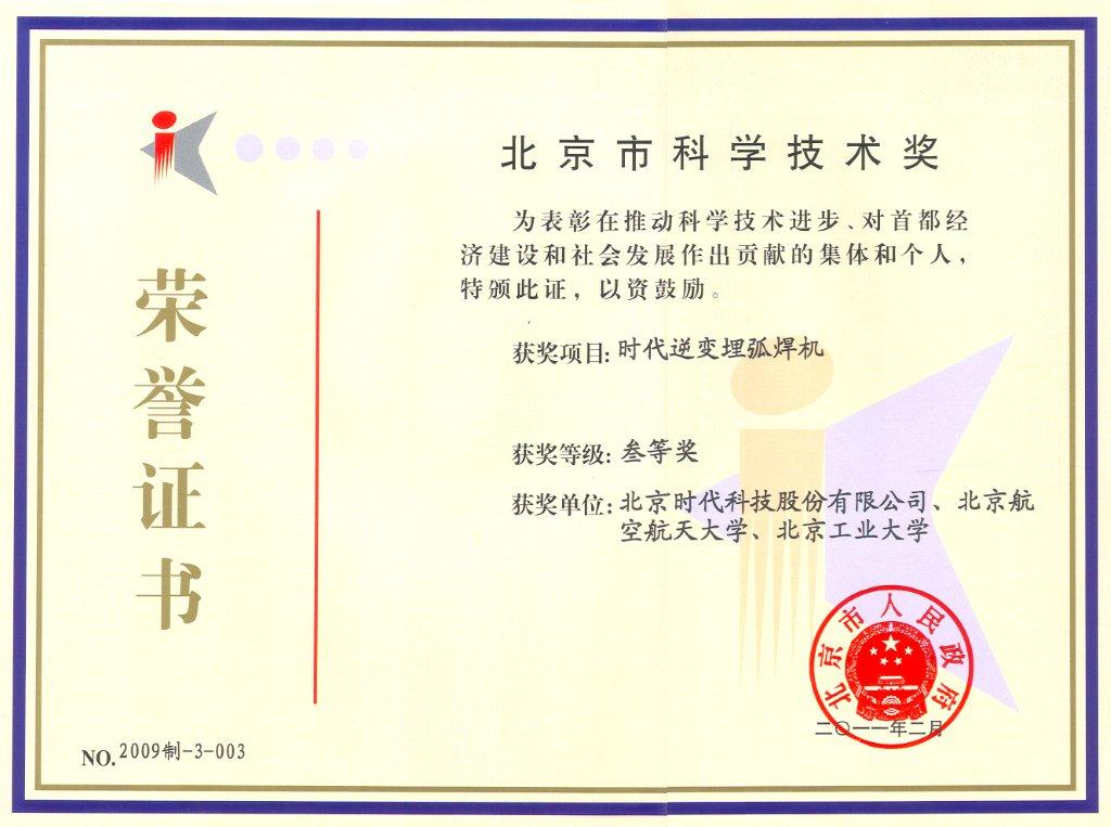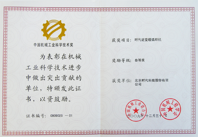 2009-12 中國機械工業(yè)科學技術獎 時代逆變埋弧焊機 中國機械工程學會