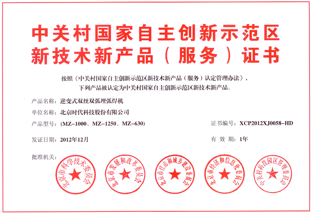 2012-12 中關村新技術新產品證書 北京市科學技術委員會