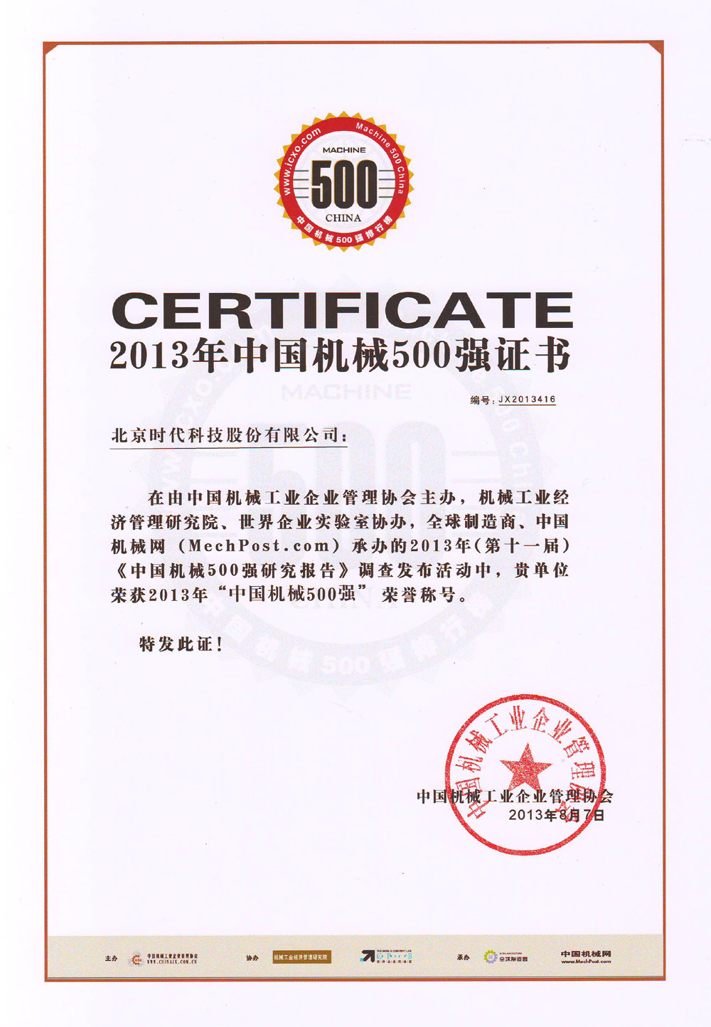 2013-08 中國機械500強 證書 中國機械工業(yè)企業(yè)管理協(xié)會
