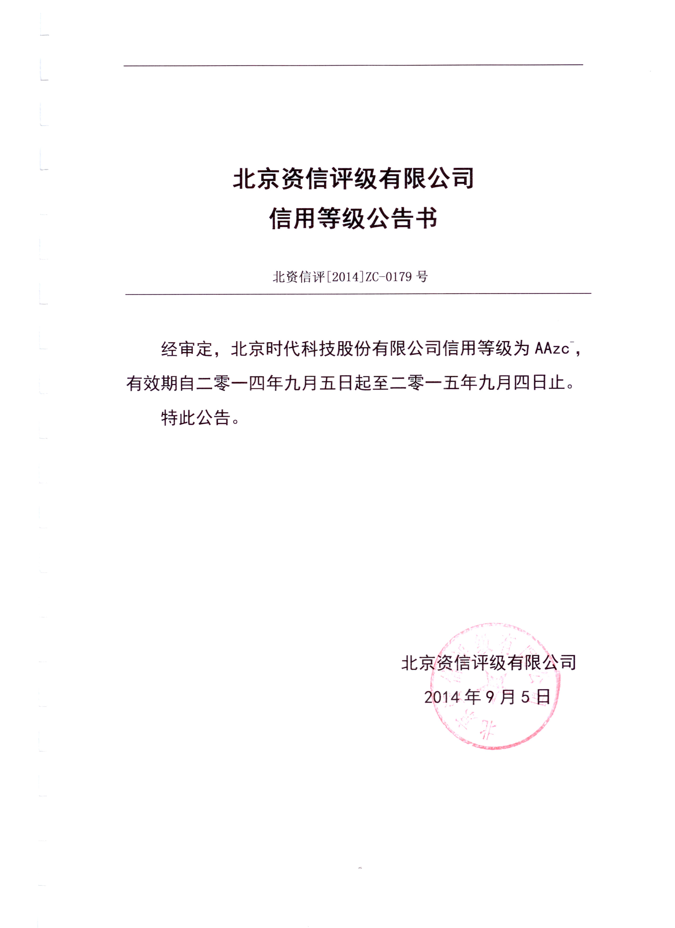 2014-11 北京時代科技股份有限公司信用等級公告書 北京資信評級有限公司