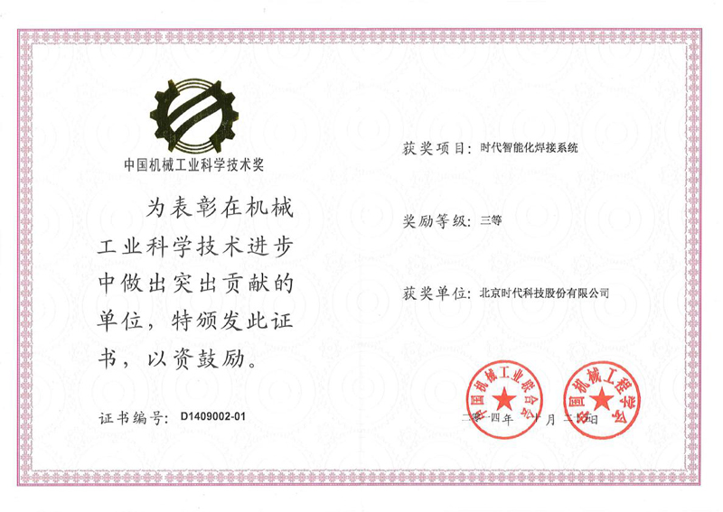 2014-12 中國機械工業(yè)科學技術獎 時代智能化焊接系統(tǒng) 中國機械工程學會