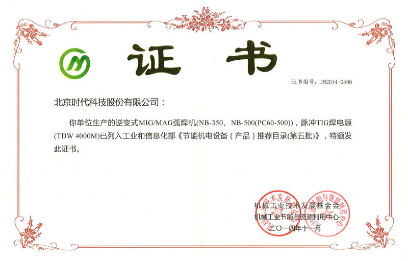 2015-01 工業(yè)和信息部《節(jié)能機電設備推薦目錄》證書 機械工業(yè)技術發(fā)展基金會