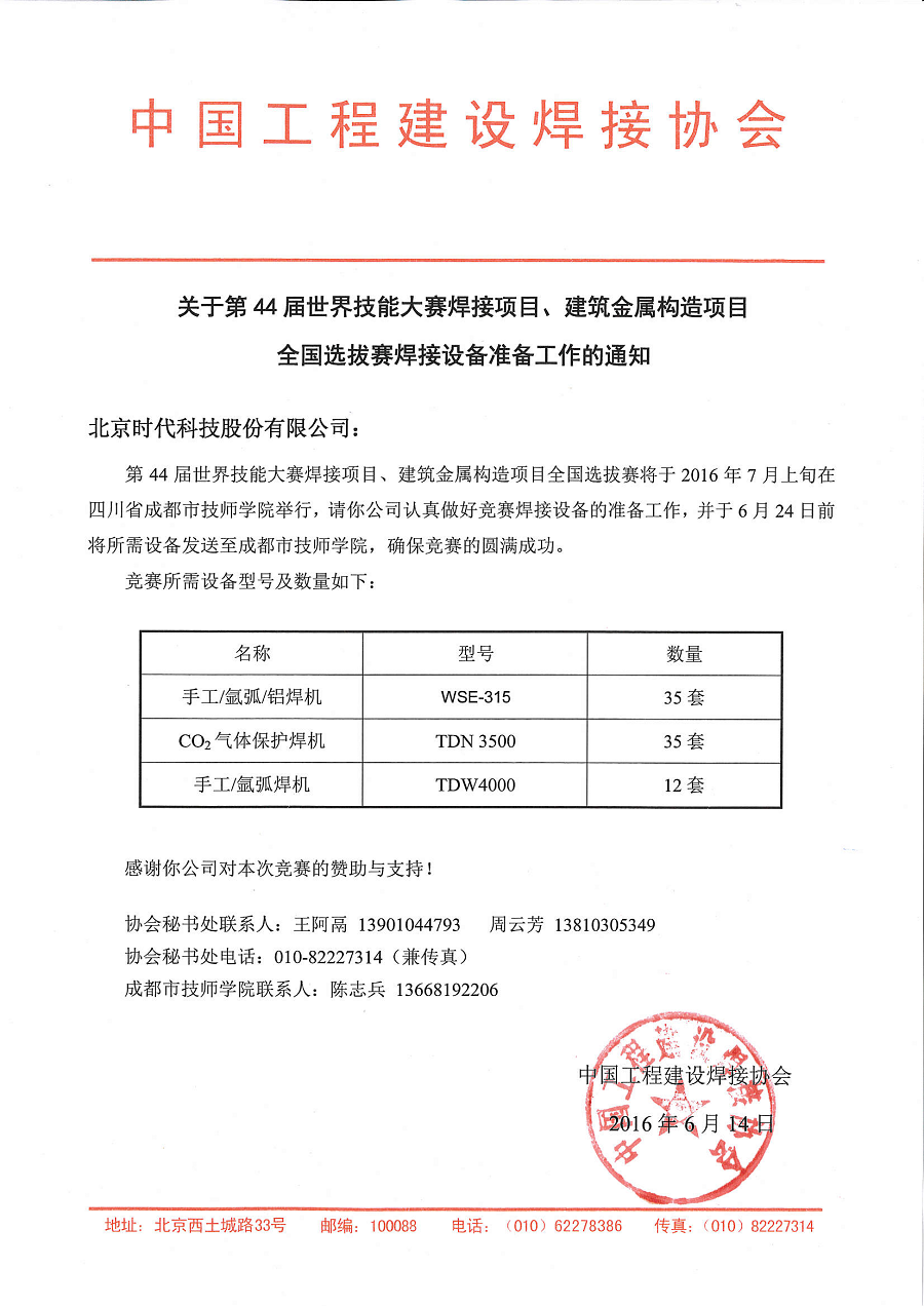 2016-06 第44屆世界技能大賽焊接項目、建筑金屬構造項目全國選拔賽唯一指定用機 中國工程建設焊接協(xié)會